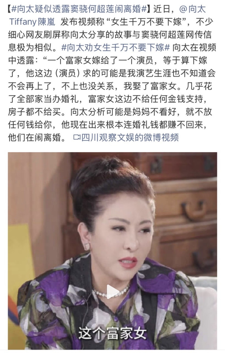 近日,@向太Tiffany陳嵐 发布视频称“女生千万不要下嫁”,不少细心网友刷屏称向太分享的故事与窦骁何超莲网传信息极为相似。#向太劝女生千万不要下嫁# 向太在视频中透露:“一个富家女嫁给了一个演员,等于算下嫁了,他这边(演员)求的可能是我演艺生涯也不知道会不会再上了,不上也没关系,我娶了富家女。几乎花了全部家当办婚礼,富家女这边不给任何金钱支持,房子都不给买。向太分析可能是妈妈不看好,就不放任何钱给你苏州恒泰配资,他现在出来根本连婚礼钱都赚不回来,他们在闹离婚。