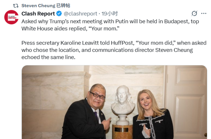 没想到,几分钟后,白宫新闻秘书卡罗琳·莱维特回复道,“是你妈选的。”(Yourmomdid.)